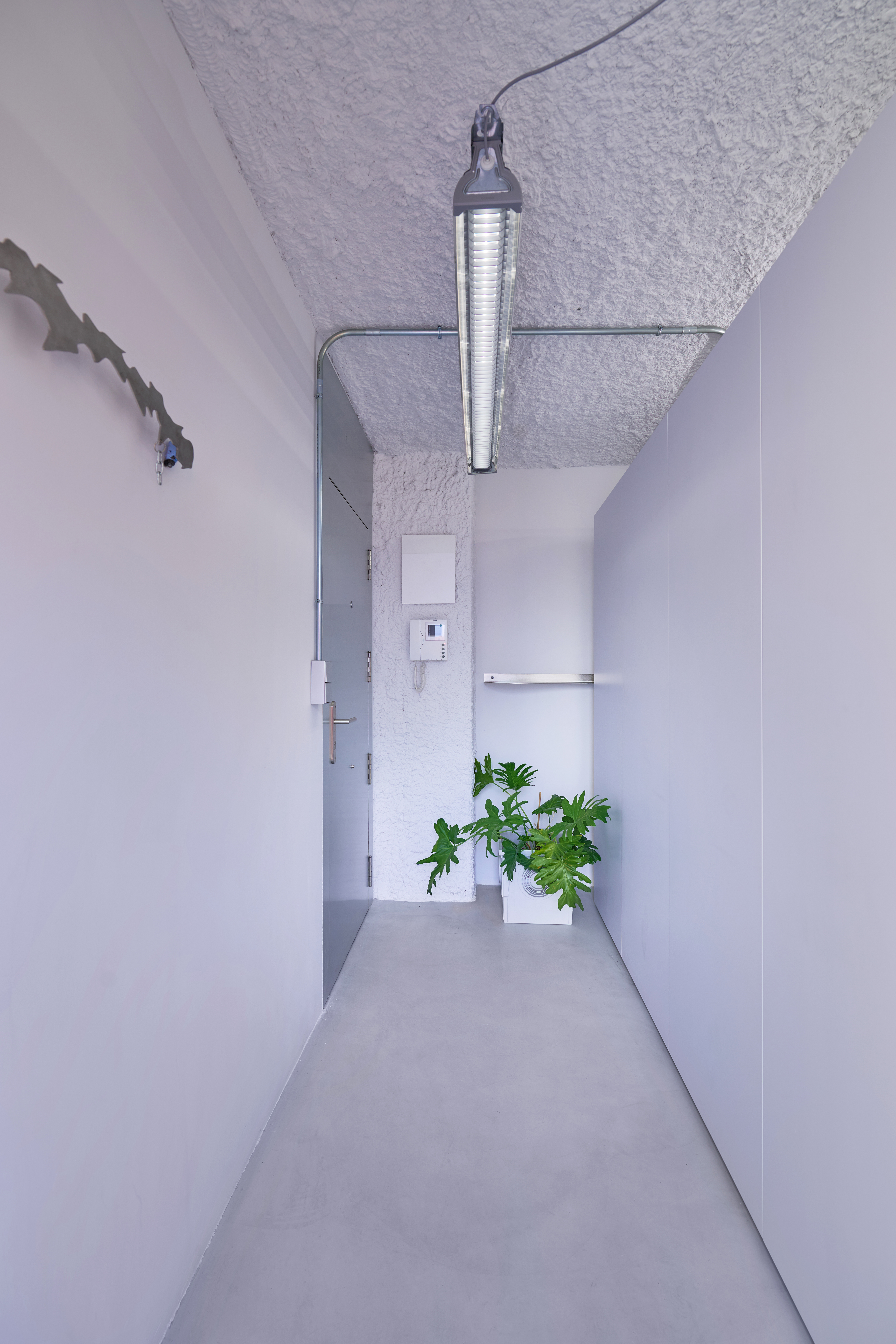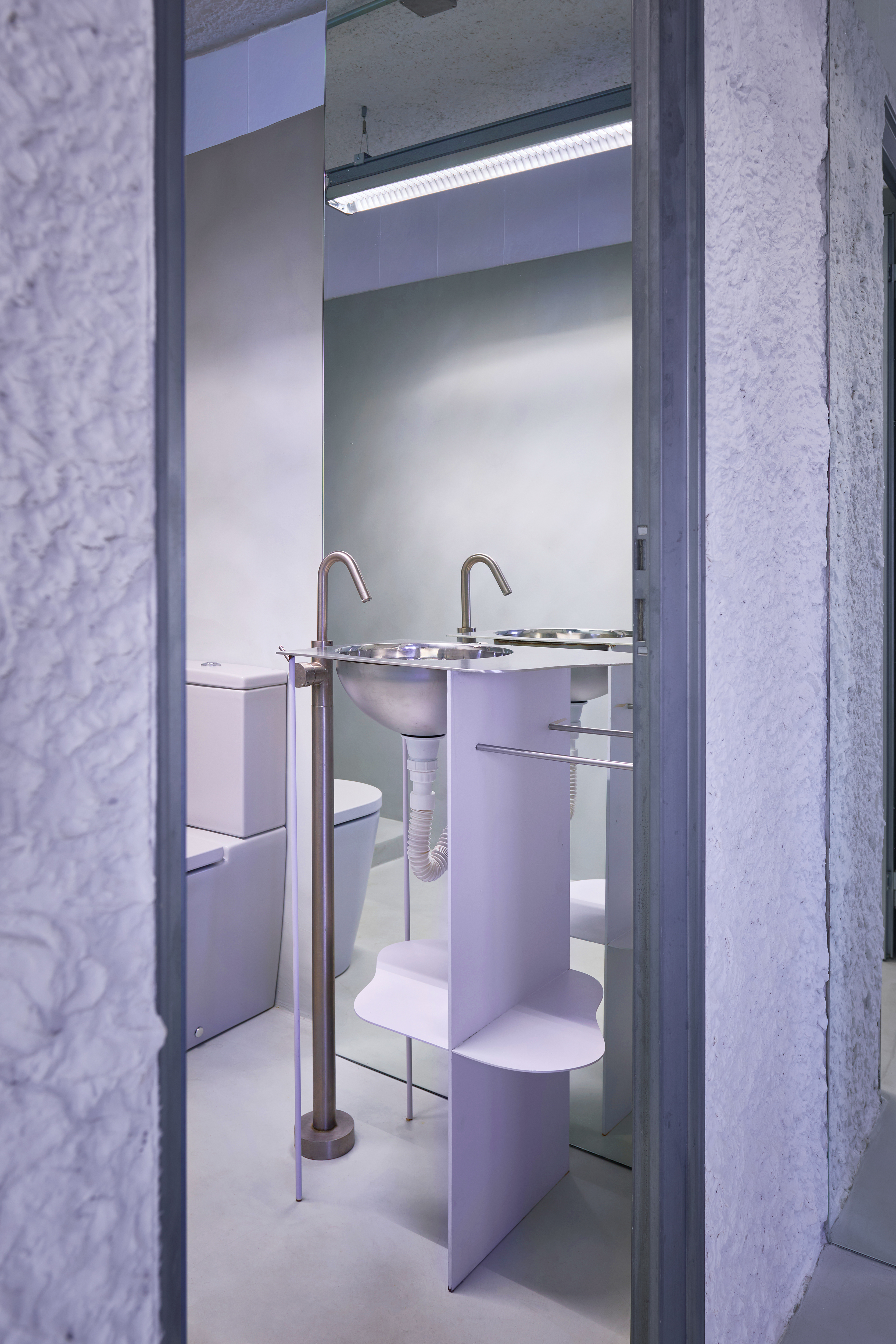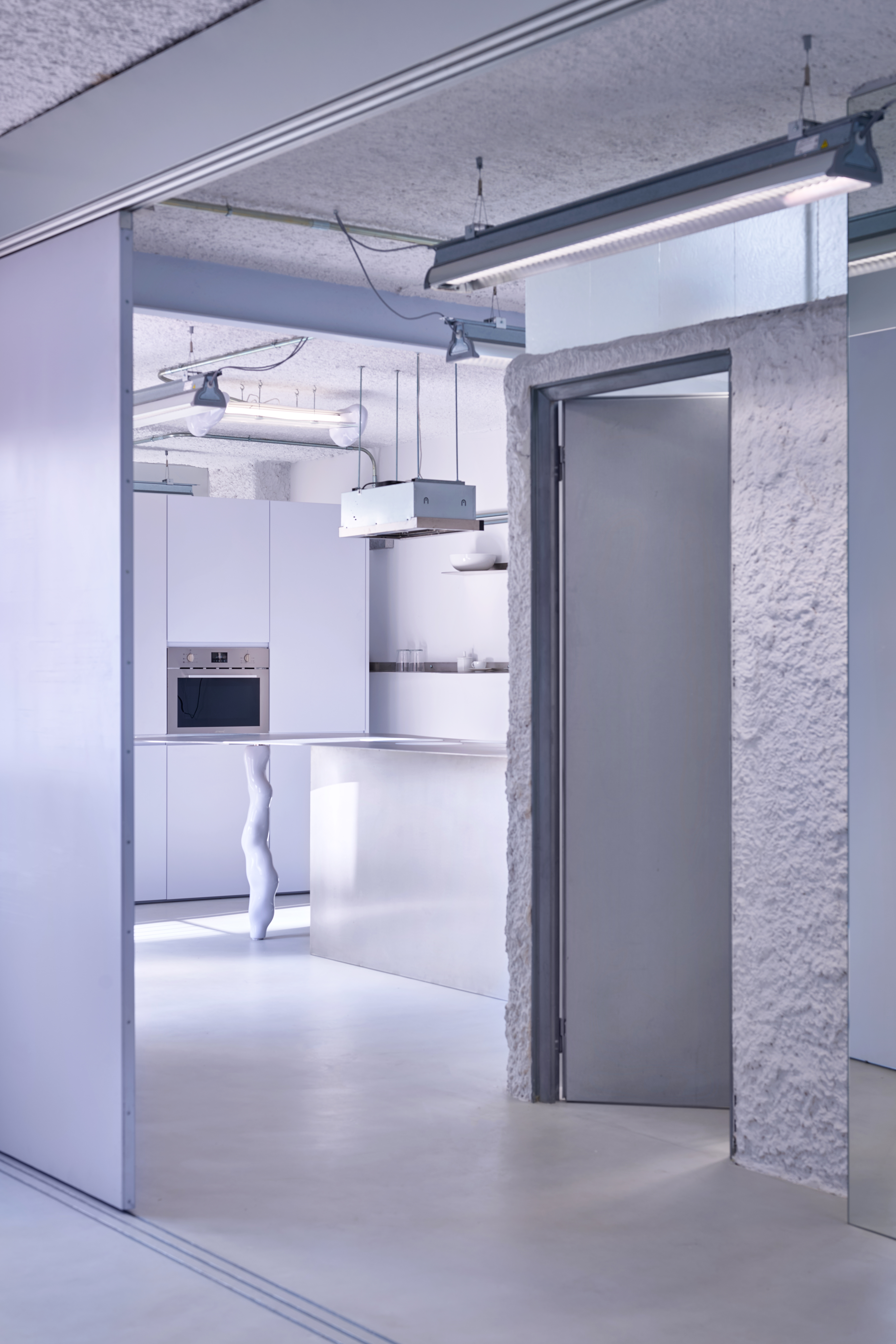 The TransMorph Apartment is not static or predefined; The structure of metal beams and concrete pillars marks a reconfigurable space through sliding T-shaped metal panels. The imperfect surfaces of projected plaster cover pillars, ceiling and bathroom core. A space that expands and retracts in response to the interaction of its inhabitants, allowing the coexistence of multiple configurations in the same temporal dimension.