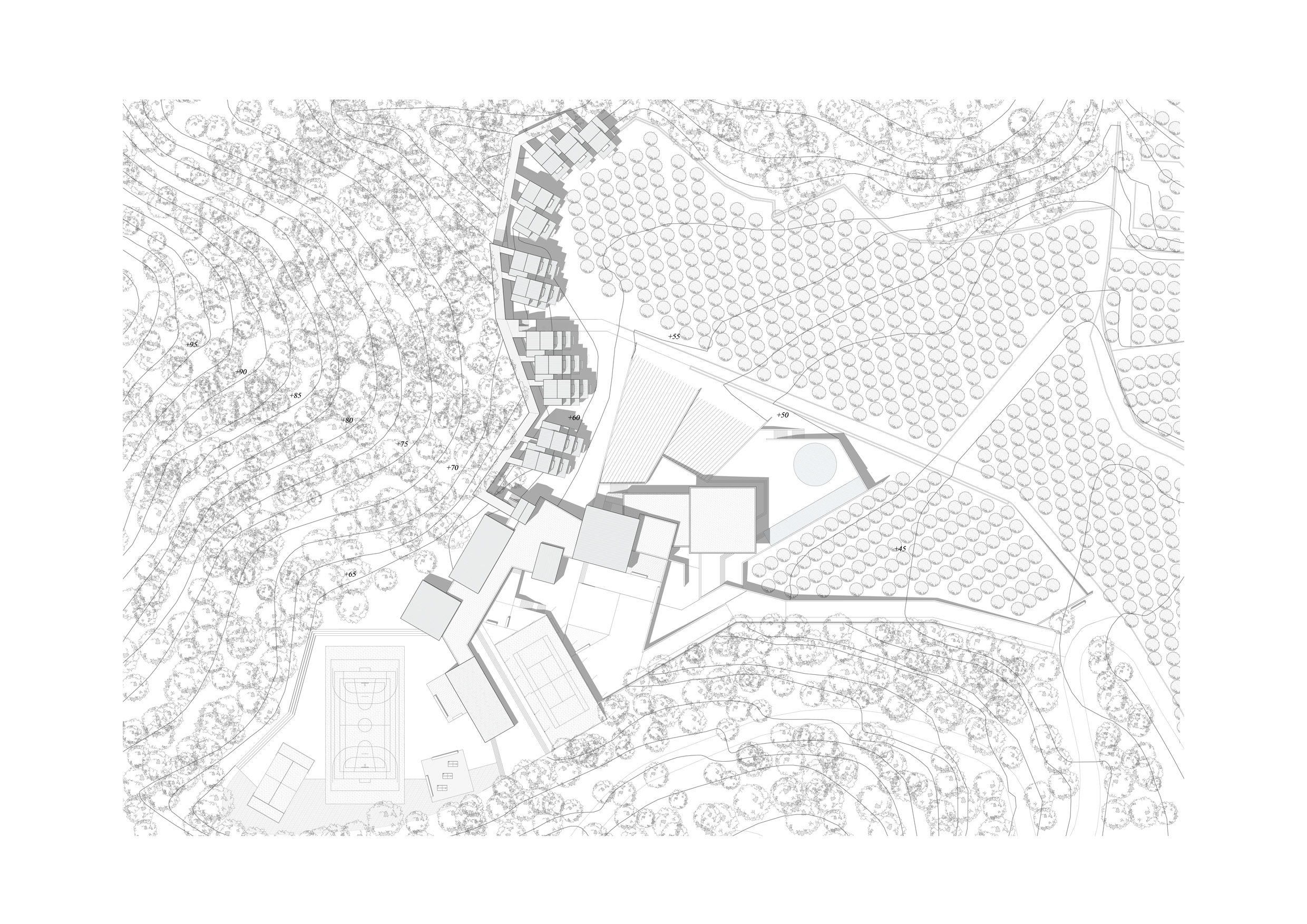 La topografía del lugar y la obtención de vistas van dislocando las piezas del programa, conformando una serie de plataformas abancaladas que estructuran las diversas funciones.